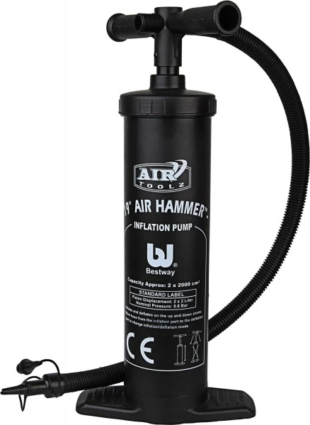 Zum Aufblasen und Absaugen geeignet. Die Doppelhubpumpe baut bis zu 1.0 bar Druck auf und enthält 3 verschiedene Adapter, um den Einsatz an vielen verschiedenen Produkten zu ermöglichen. Mit 2 x 2.000 ccm Pumpvolumen geht ihr nicht so schnell die Luft aus, Höhe 48 cm.