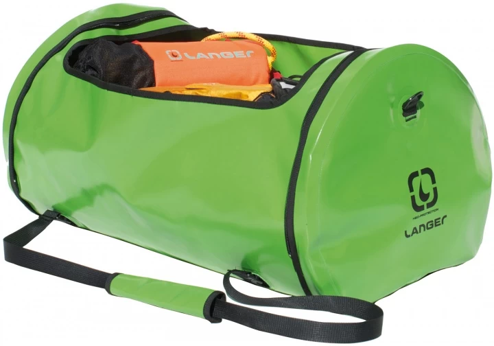 Multifunktionstasche mit vollverschweißtem Taschenkörper aus strapazierfähigem Planenmaterial (Polyestergewebe PVC-beschichtet 600g/m²). Verhindert das Auslaufen von Wasser aus nasser Wassersportbekleidung. Der gepolsterte Überschlagdeckel läßt sich einfach abnehmen und dann als Standfläche oder Sitzkissen bei der Pause verwenden.