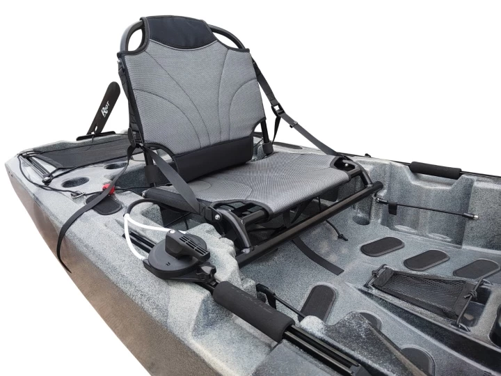 Besonders stabile Angelplattform mit bester Übersicht durch höhenverstellbaren Sitz und agil durch Pedalantrieb. Für den Transport, oder wenn es nur mit dem Paddel auf´s Wasser gehen soll, lässt sich der Antrieb einfach entnehmen.