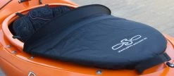 Robuste Spritzdecke mit Teller aus beschichtetem Planenmaterial (Valmex®, 520 g/m²) und Kamin aus weichem Nylon. Alle Nähte getaped, Griffschlaufe aus strapazierfähigem Nylongurtband. Die Weite des Kamins ist mittels Gummizug anpassbar. Verstellbare Schulterträger mit Steckschnallen vervollständigen den hochwertigen Eindruck.